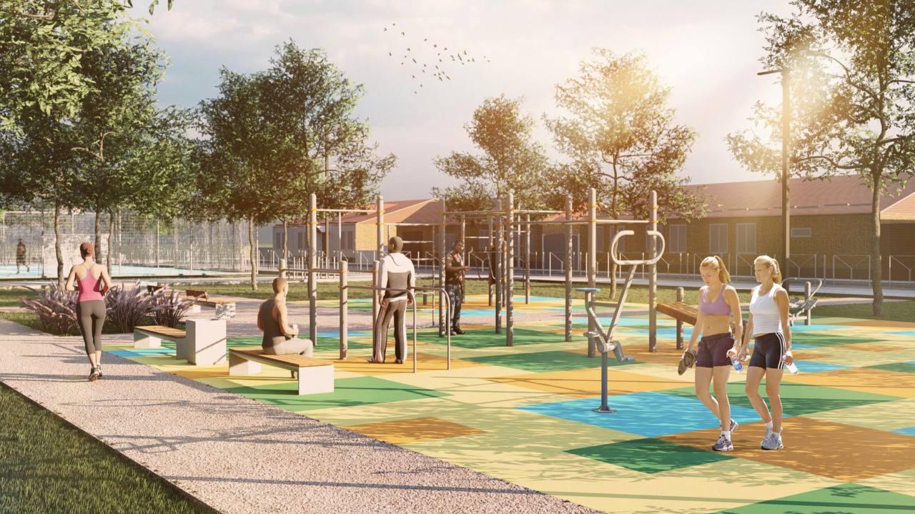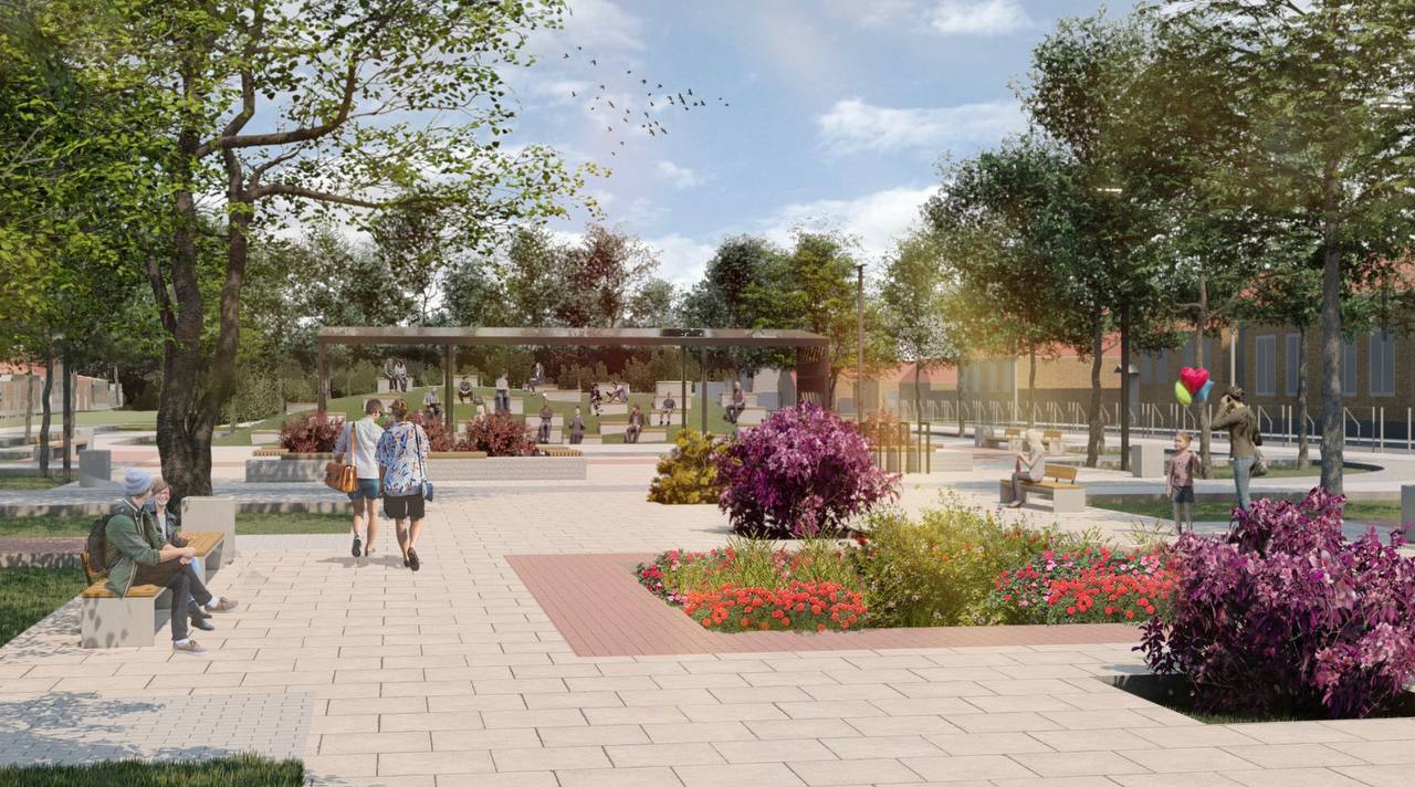 Территория будет разделена на 8 зон: две площади – фестивальная и мемориальная; историко-культурная, прогулочная и спортивная зоны; городской сад; детская площадка; зона отдыха с качелями. Также предусмотрены уличные тренажеры, турники, шведские стенки и отдельное игровое поле для командных игр с мячом. Будут оборудованы парковка, навес с качелями, многофункциональная детская площадка и тд.